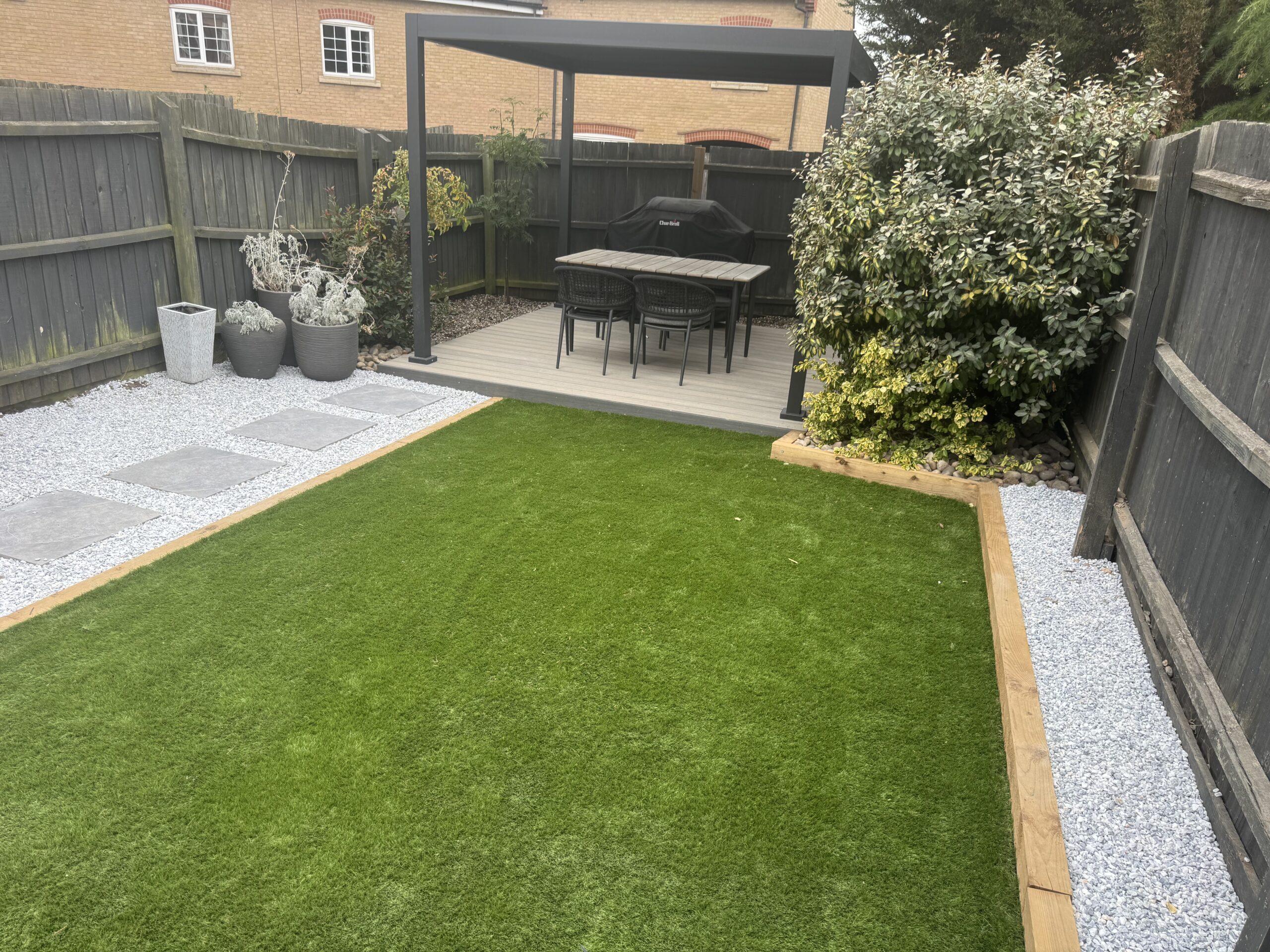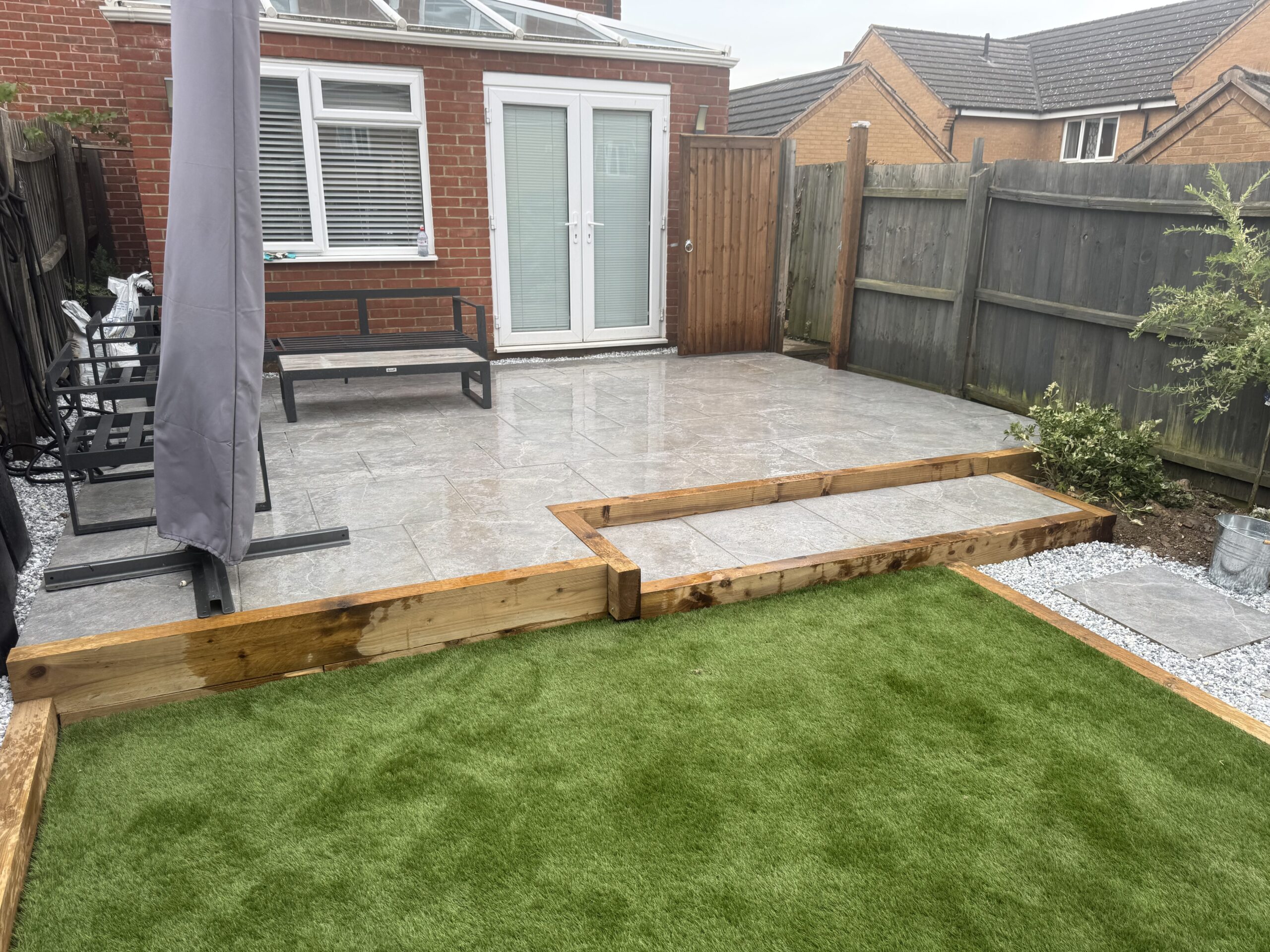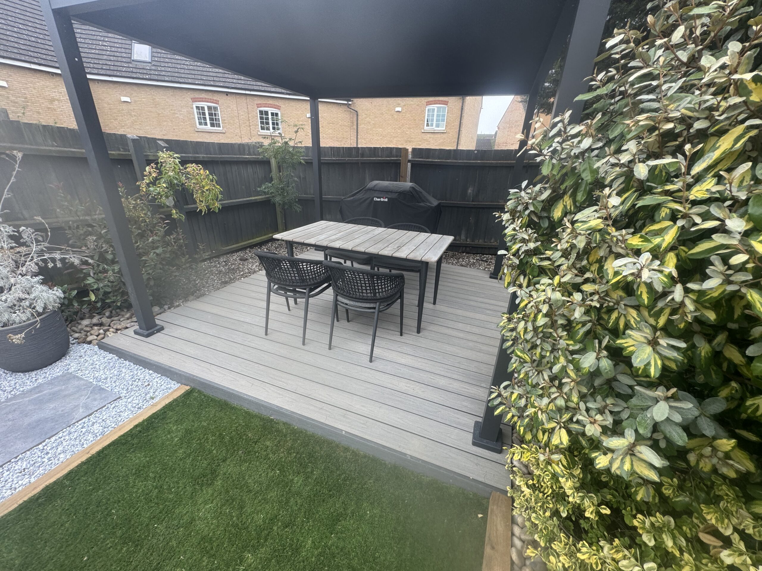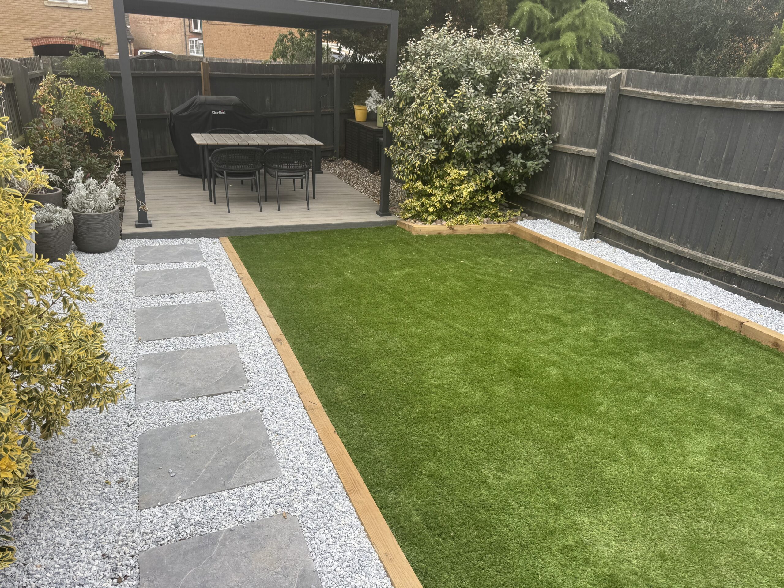 Lovely job this. We completely gutted the garden and started on the composite decking and the pergola, we then started on the steps and main patio finished off with porcelain. Garden finished off with 40mm artificial grass with a sleeper boarder and porcelain stepping stone path finished off with decorative stone.