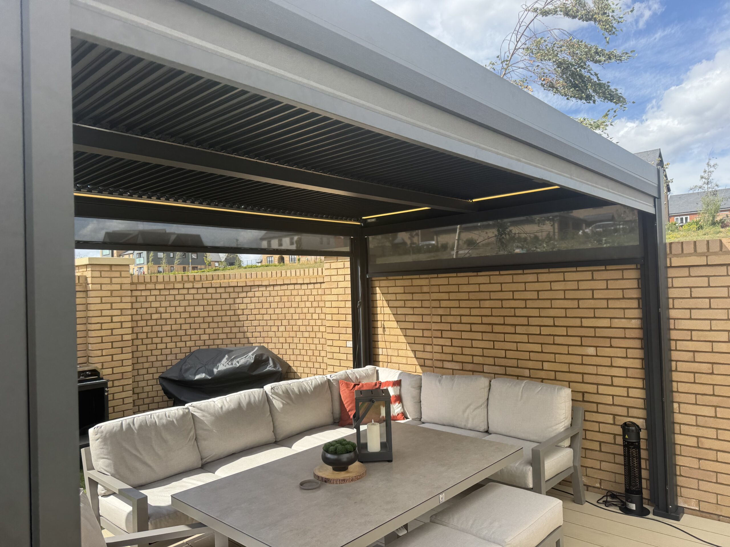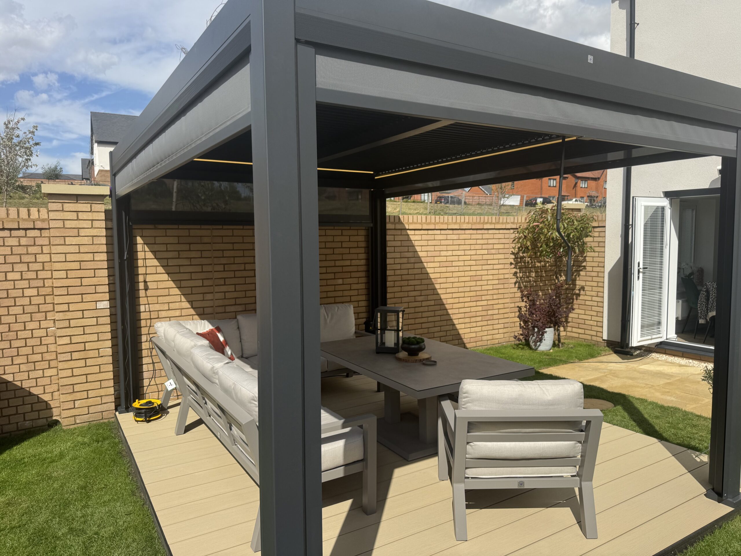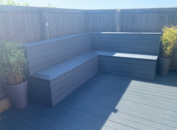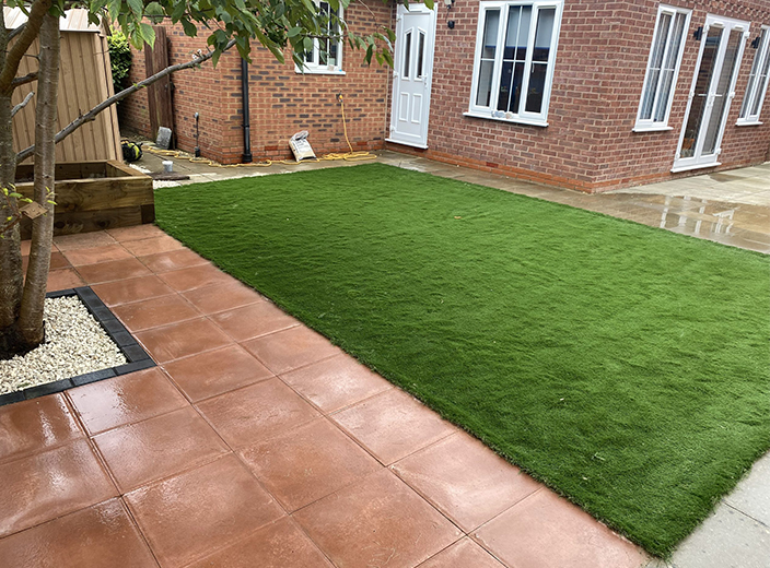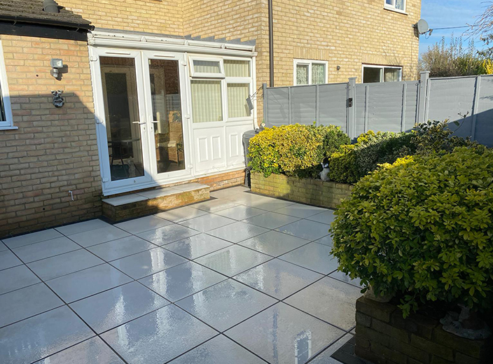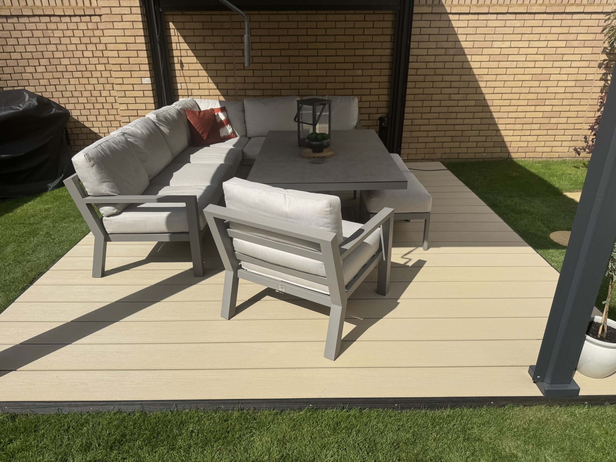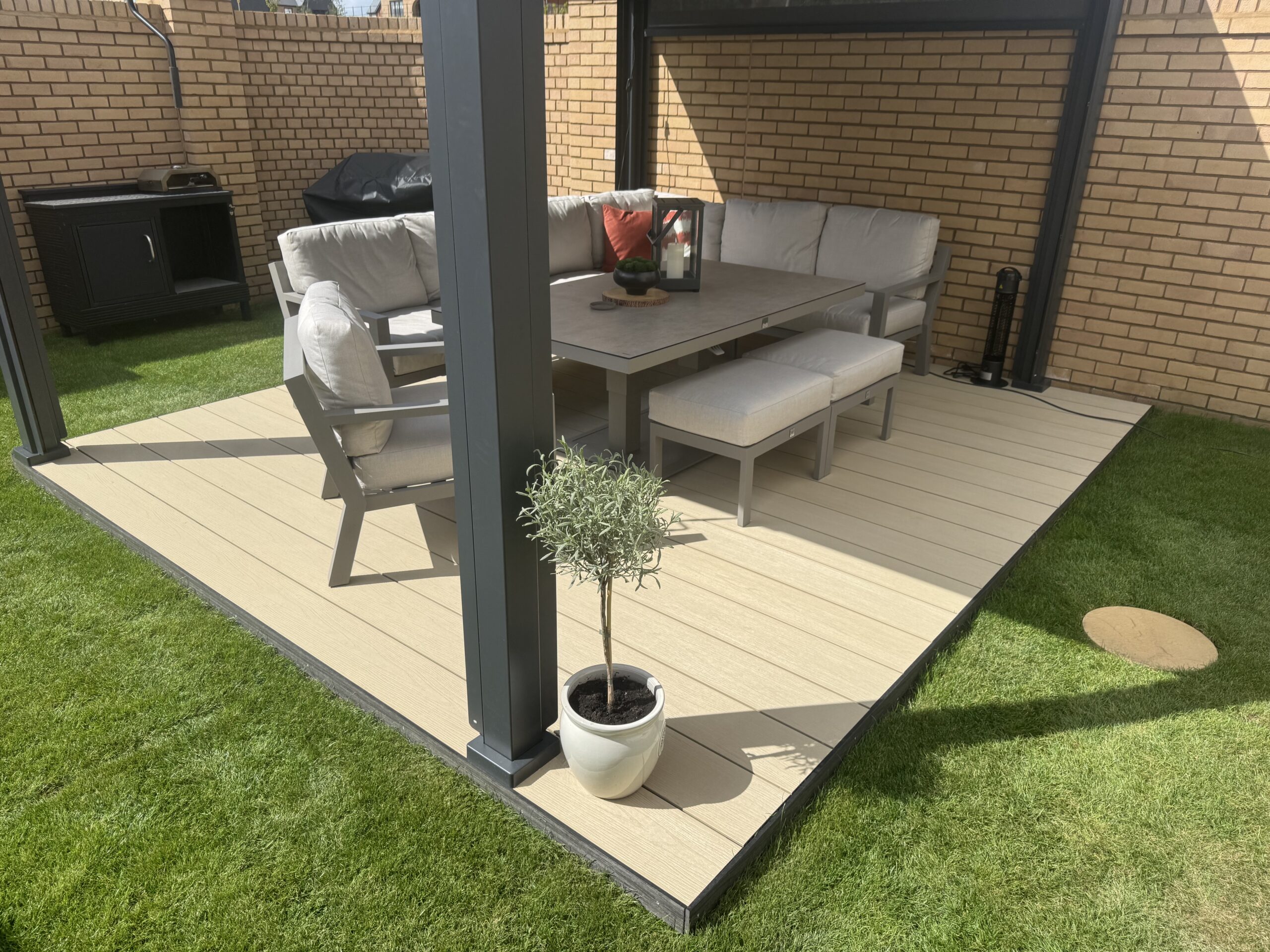 Lovely job this. We completely gutted the garden and started on the composite decking and the pergola, we then started on the steps and main patio finished off with porcelain. Garden finished off with 40mm artificial grass with a sleeper boarder and porcelain stepping stone path finished off with decorative stone.