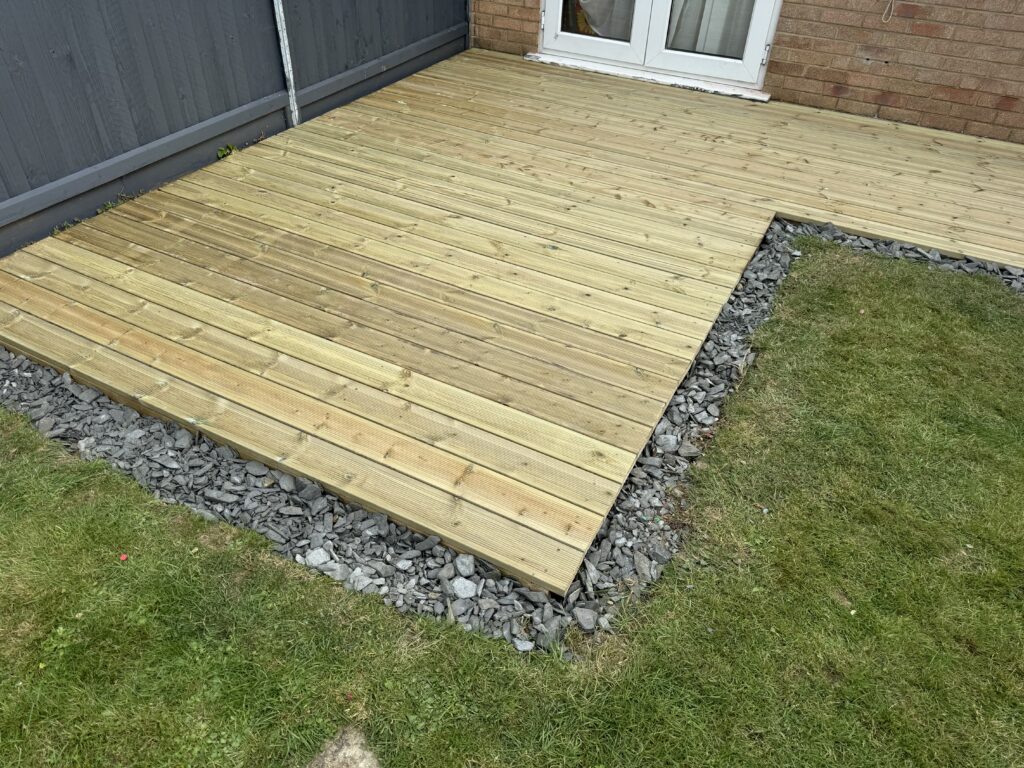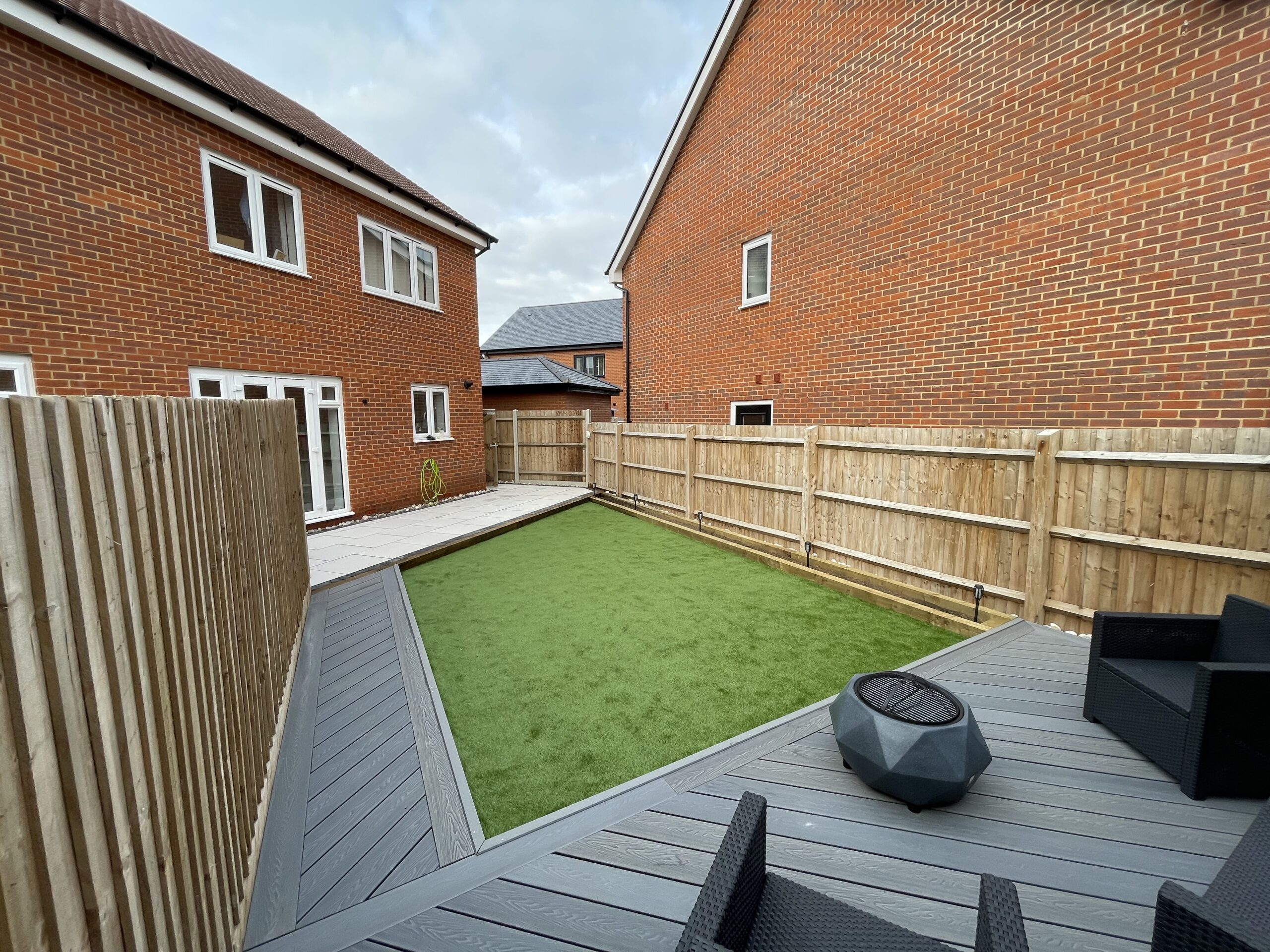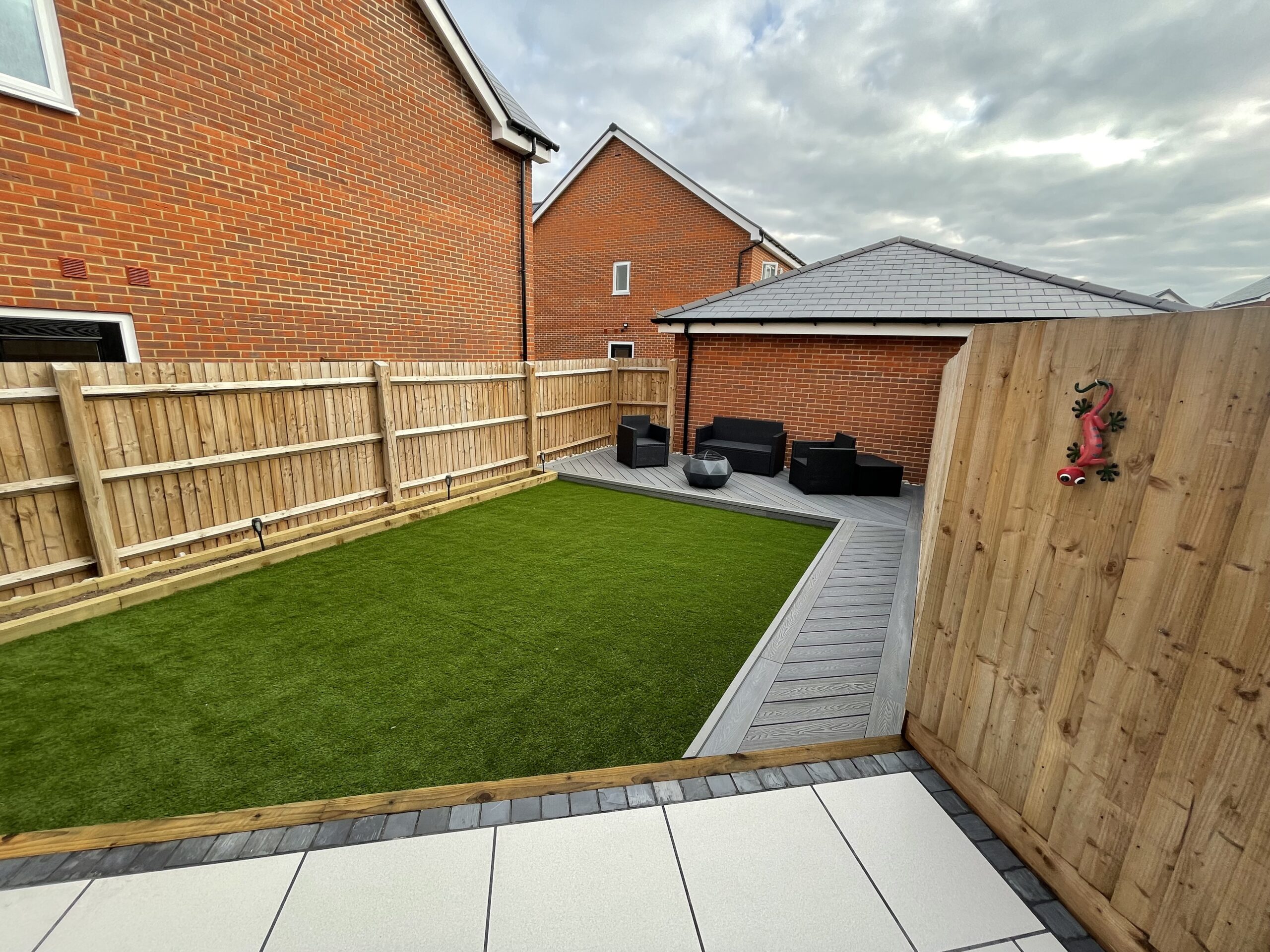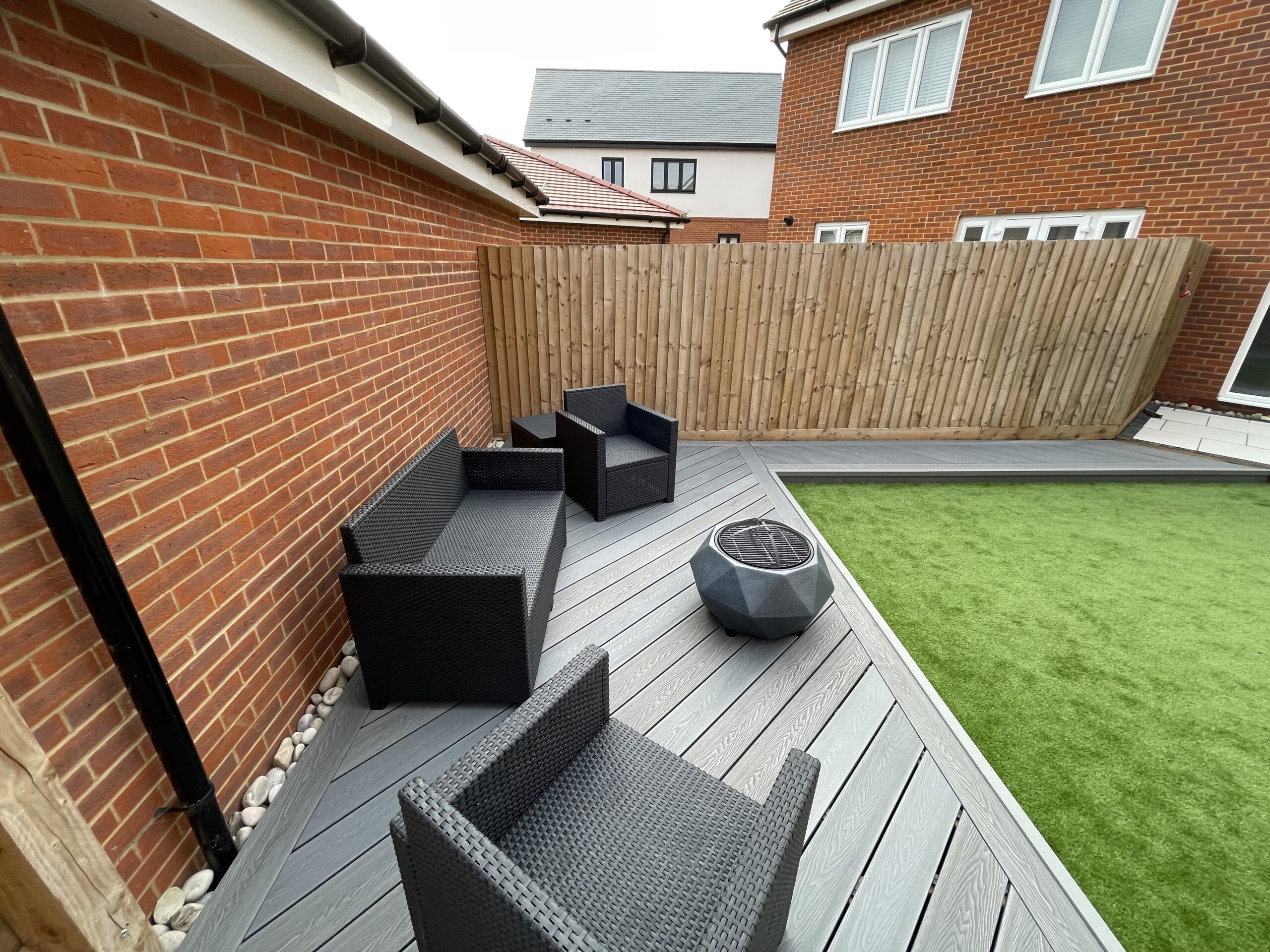 We completely ripped out the grass and old slabs. We then built up the main patio and installed some nice white porcelain slabs. We then concentrated on the decking by building the frame then some angled cuts around a straight boarder which turned out to look stunning. We finished off with 40mm artificial grass and sleeper beds. The end result was purely beautiful.